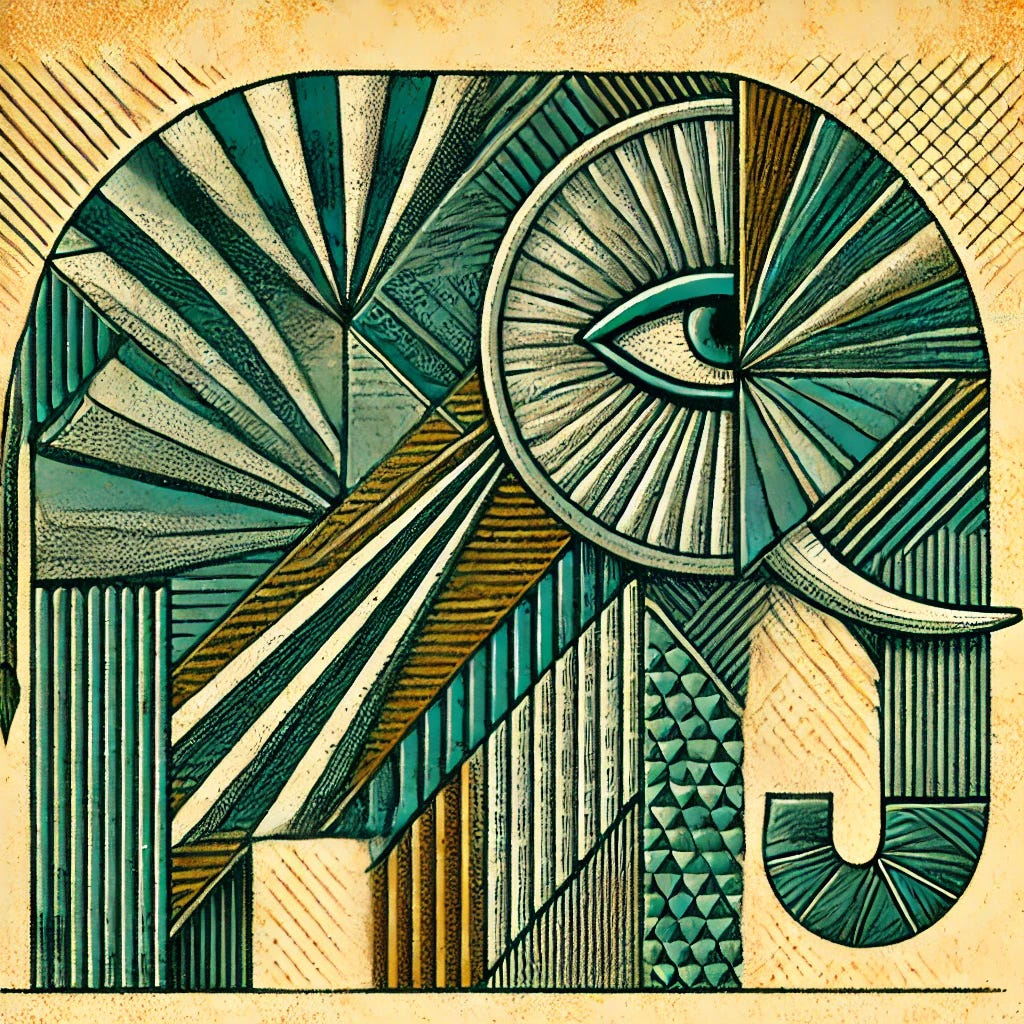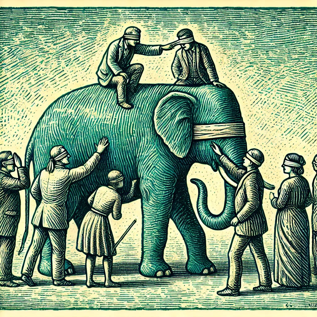 There's an old parable from India about blind people trying to understand an elephant. One person touches the trunk and says "An elephant is like a snake." Another feels the leg and says "No, it's like a tree trunk." A third touches the ear and insists "You're both wrong. It is like a fan."